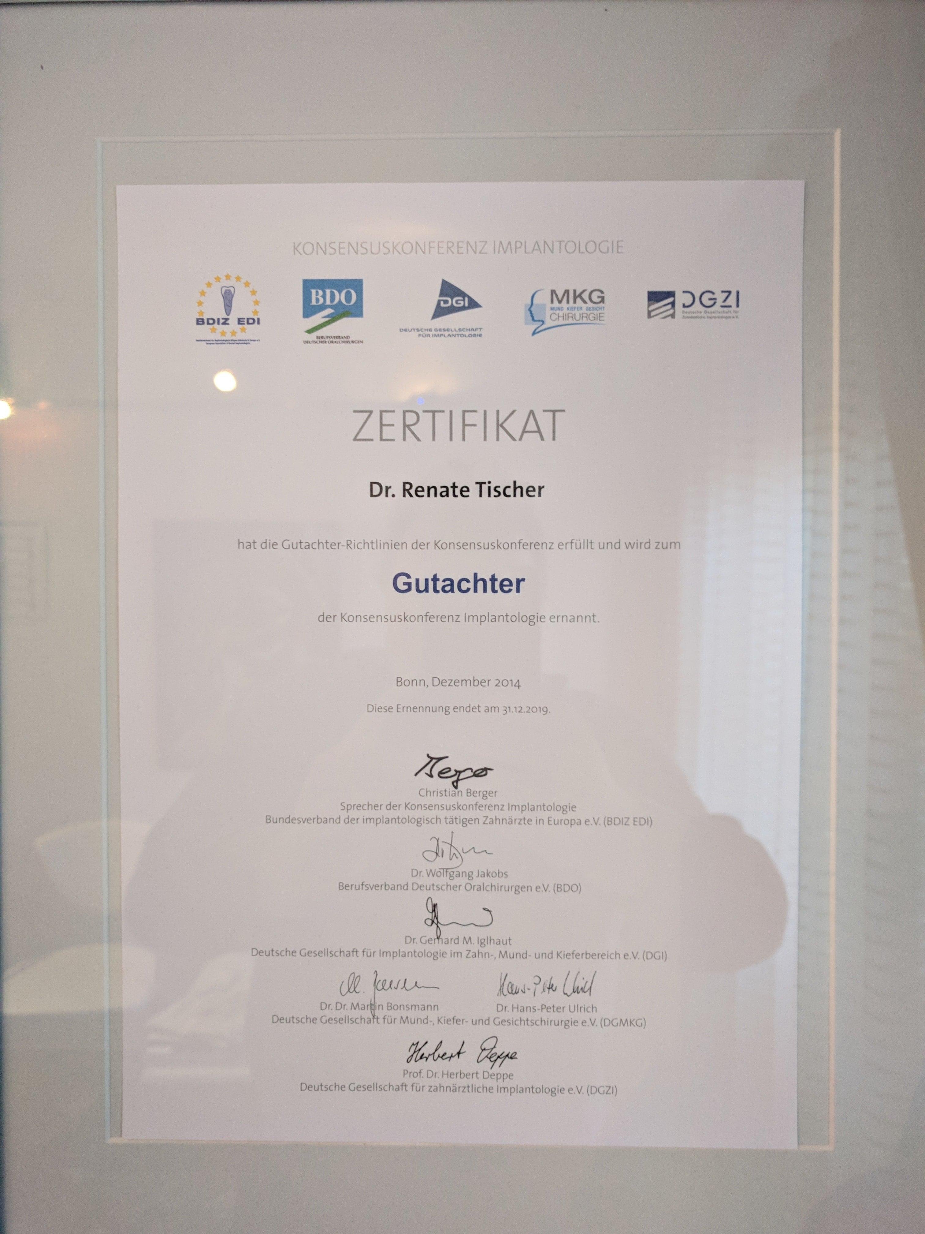 - Zertifikat Gutachter Implantologie Dr. Renate Tischer